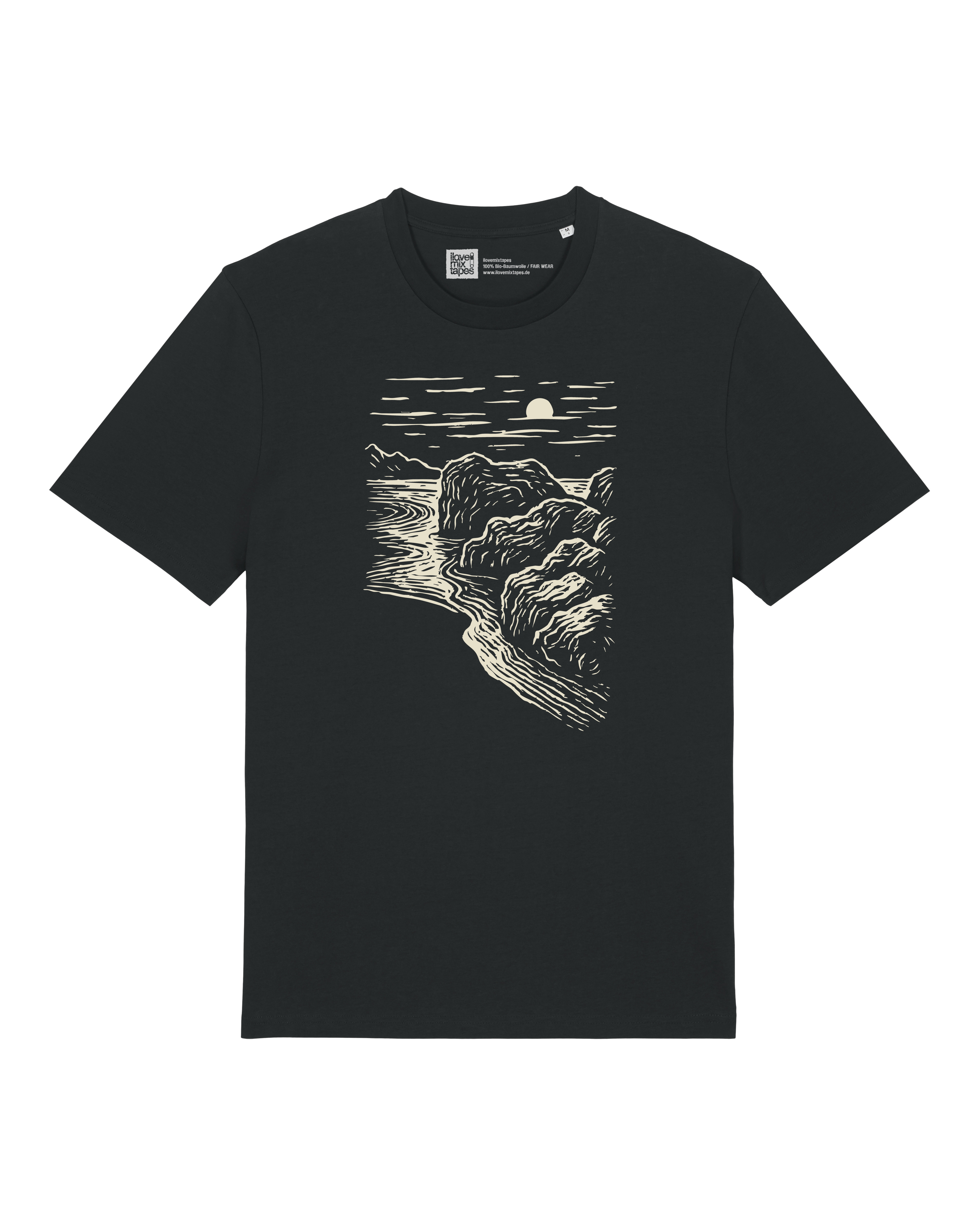 Hochwertiges Unisex T-Shirt aus 100 % Bio-Baumwolle in Schwarz – mit handgedrucktem „Black Beach“-Motiv in Beige. Das Motiv basiert auf einem vektorisierten Linolschnitt, inspiriert von einem Foto, das auf Teneriffa entstanden ist. In meinem Atelier wird es per Siebdruck-Transferverfahren von Hand aufgebracht – mit veganer, langlebiger Farbe.