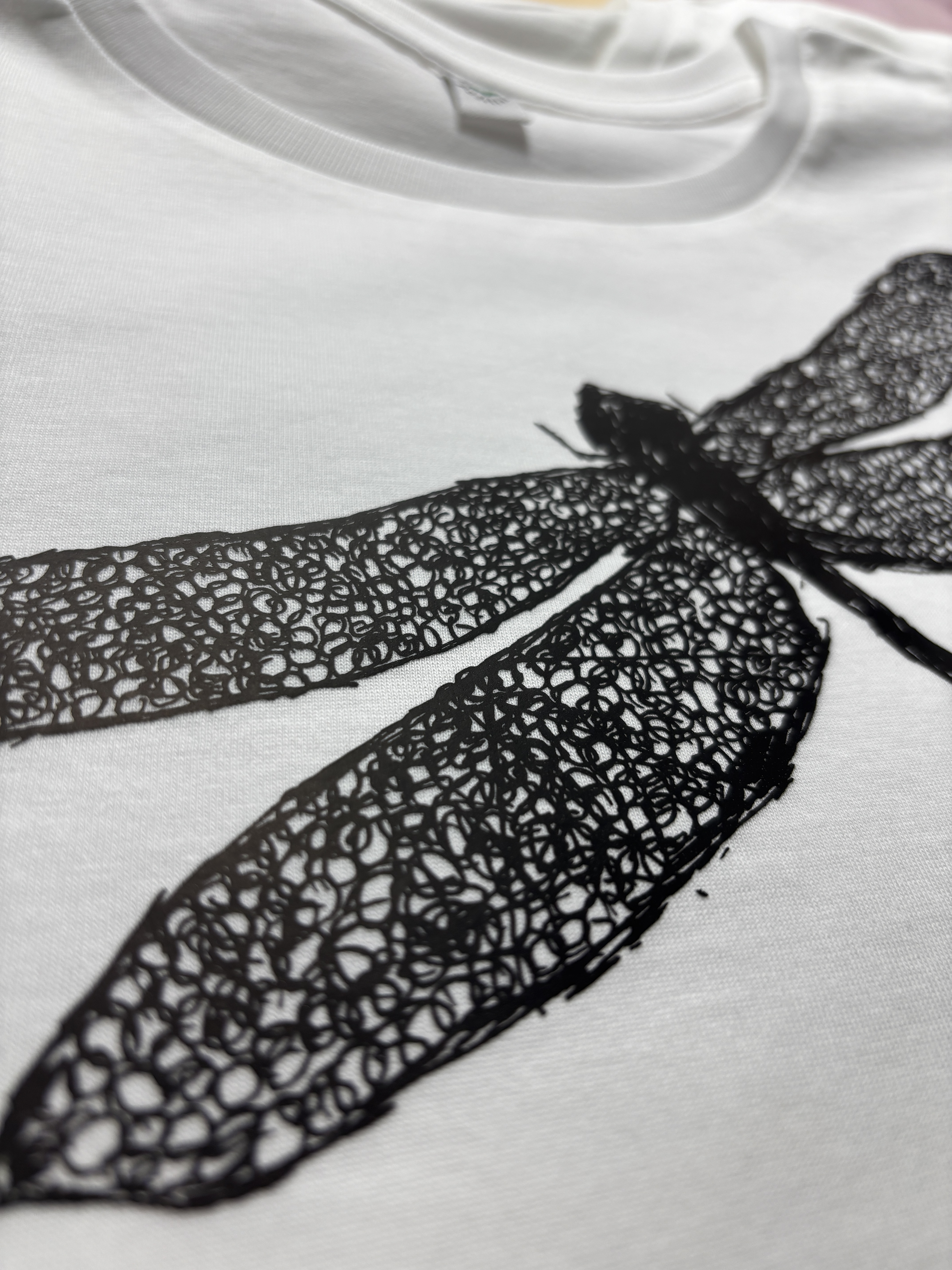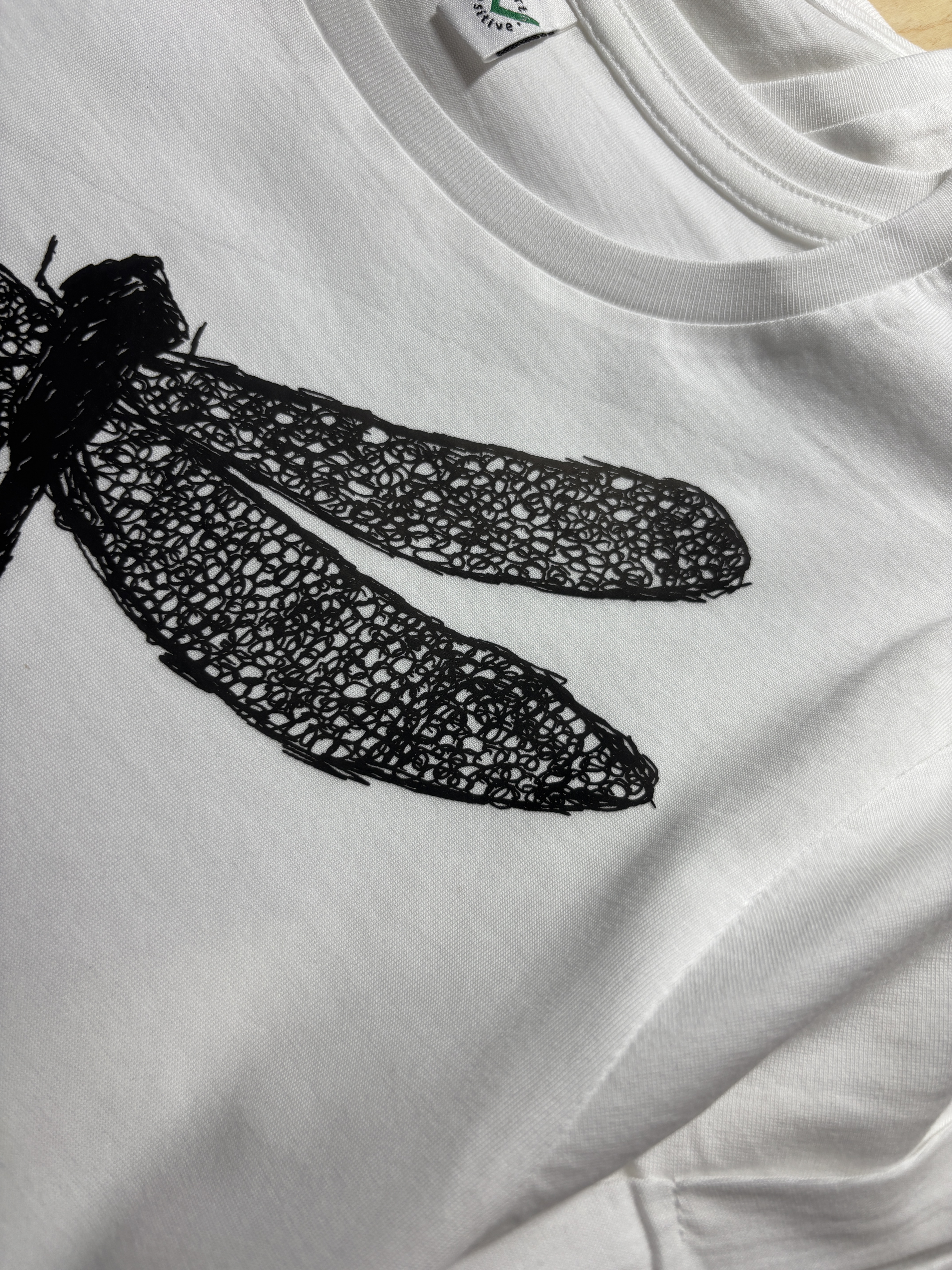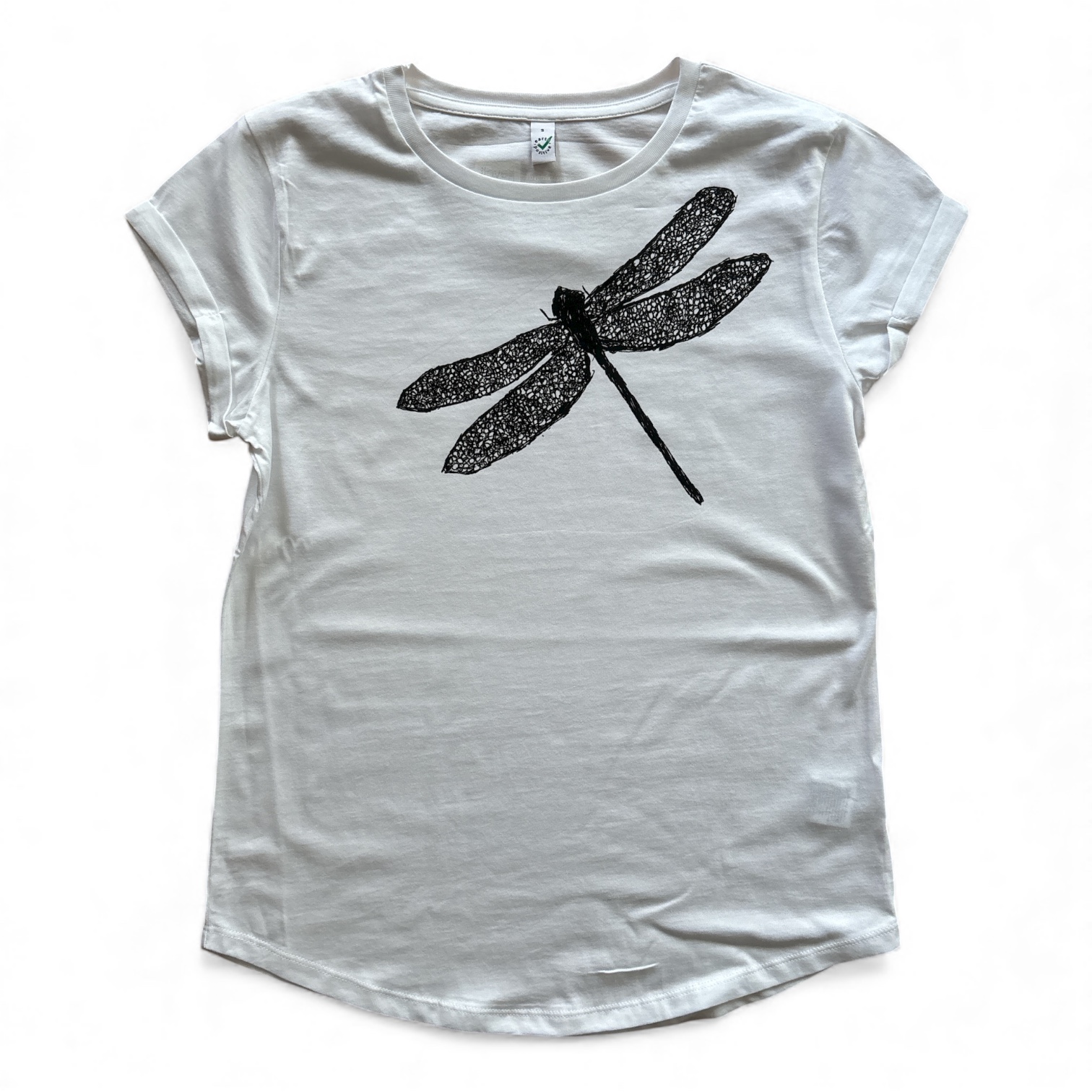 Dieses weiße Damen Bio-T-Shirt ist mehr als nur ein Kleidungsstück – es ist ein Stück Achtsamkeit zum Anziehen. Die feine Libelle stammt aus meiner eigenen Handzeichnung und wird von mir per Siebdruck-Transfer in liebevoller Handarbeit auf jedes Shirt gebracht.