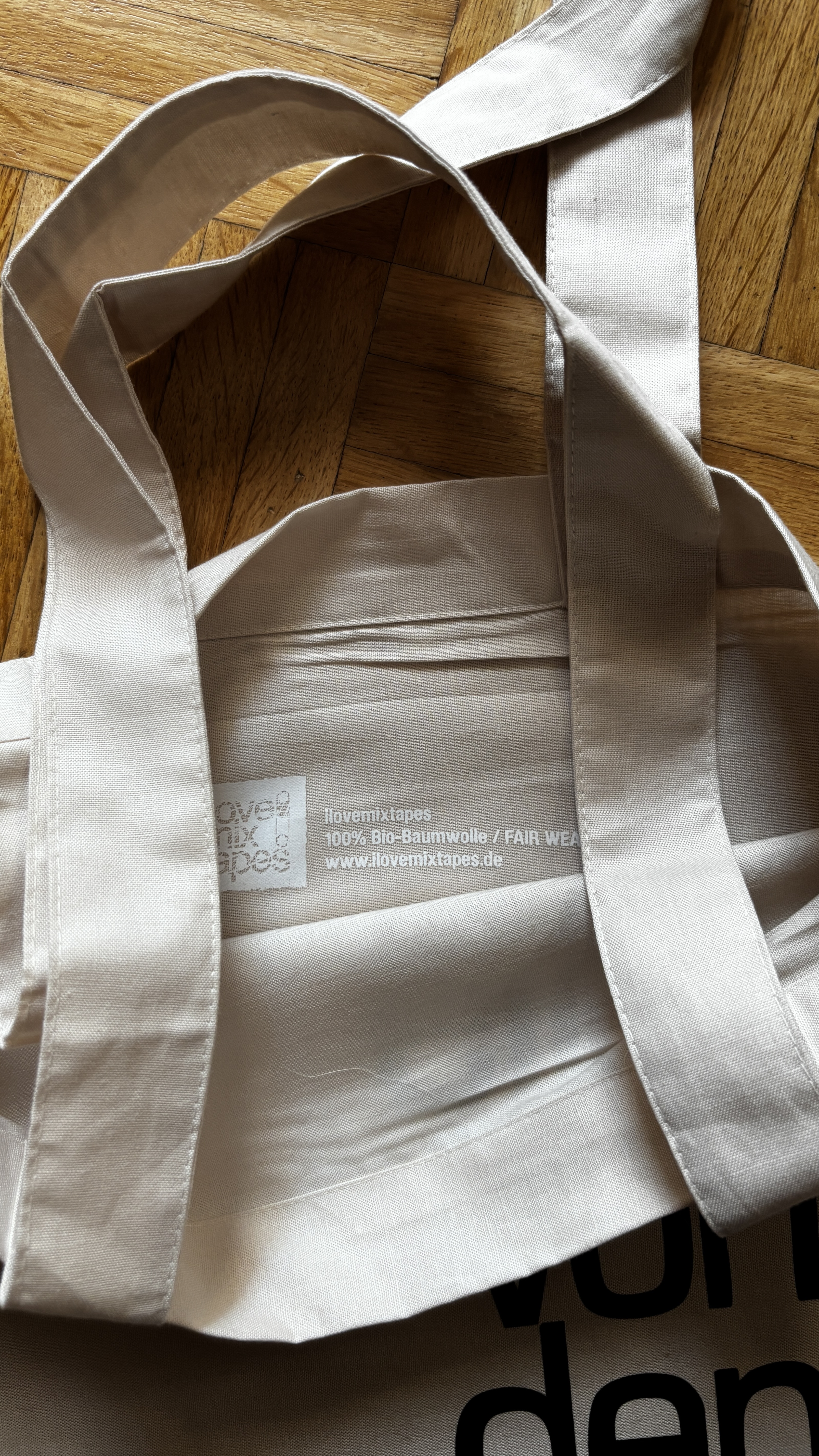 Material: 100 % zertifizierte Bio-Baumwolle • Grammatur 170 g/m² • Fairwear • Siebdruck-Transfer • Größe 36 × 40 cm • Farbe Light Beige • Druckfarbe Schwarz • Lange Henkel, nachhaltig & vegan.