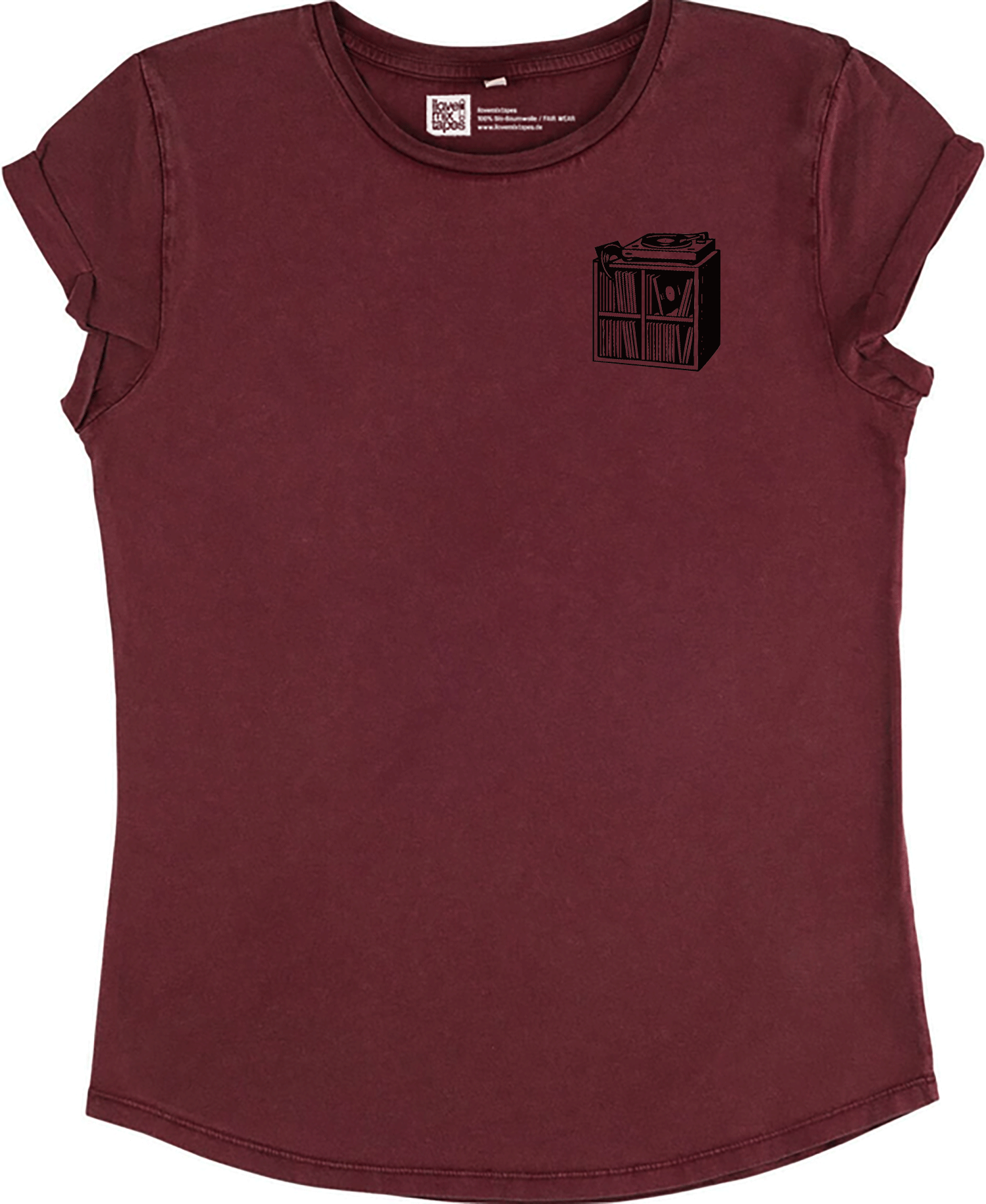 Das Damen Bio-T-Shirt „Das kleine Schallplattenregal“ kombiniert zeitloses Design mit einer liebevollen Hommage an den analogen Sound.
