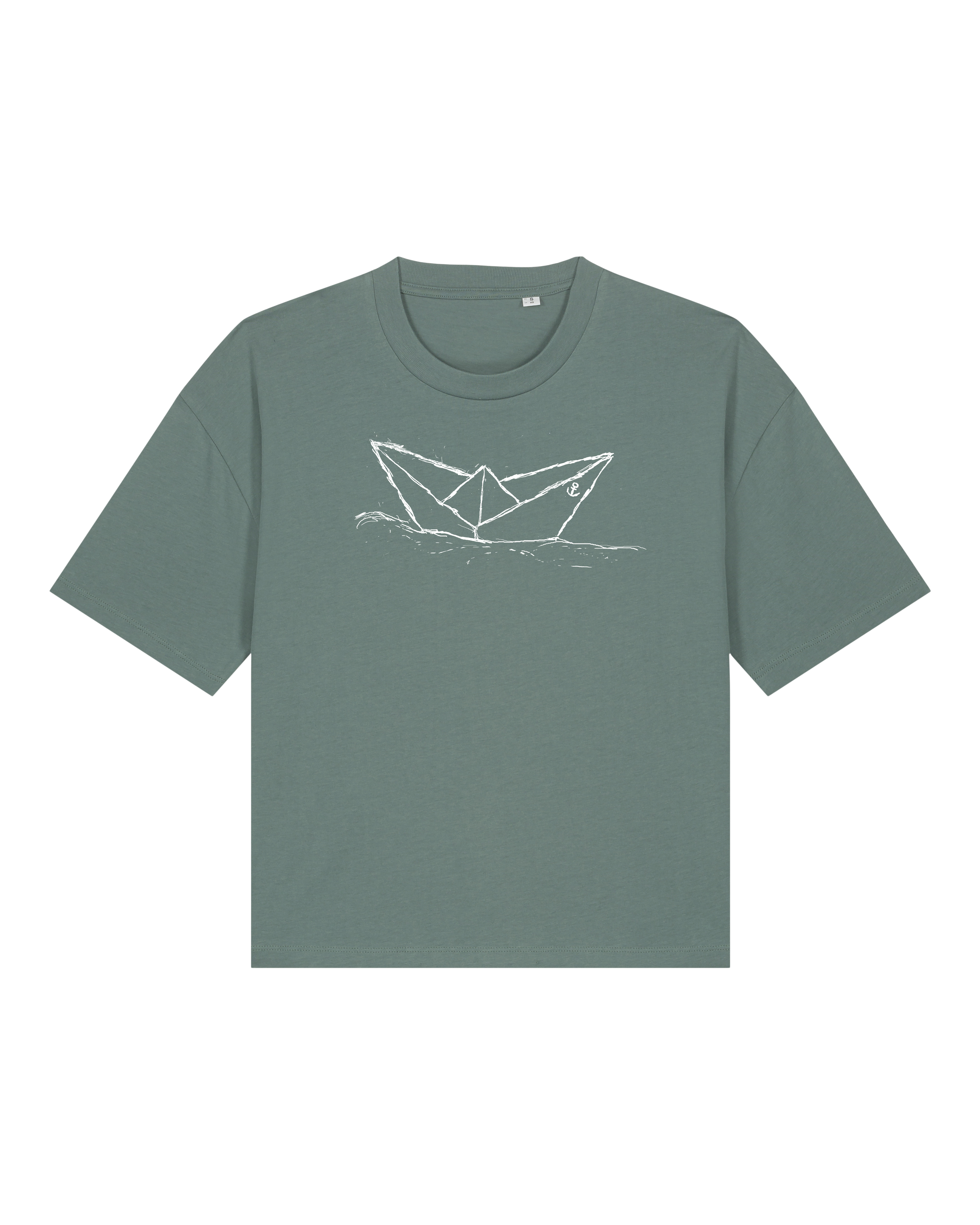 Dieses T-Shirt in der Farbe Green Bay besteht aus 100 % Bio-Baumwolle und wird in meinem Atelier in Frankfurt per Siebdruck-Transferverfahren von Hand bedruckt. Das schlichte, weiße Paperboat-Motiv stammt aus meiner eigenen Feder – eine kleine, grafische Illustration mit viel Persönlichkeit. Jedes Shirt ist ein handgefertigtes Unikat.