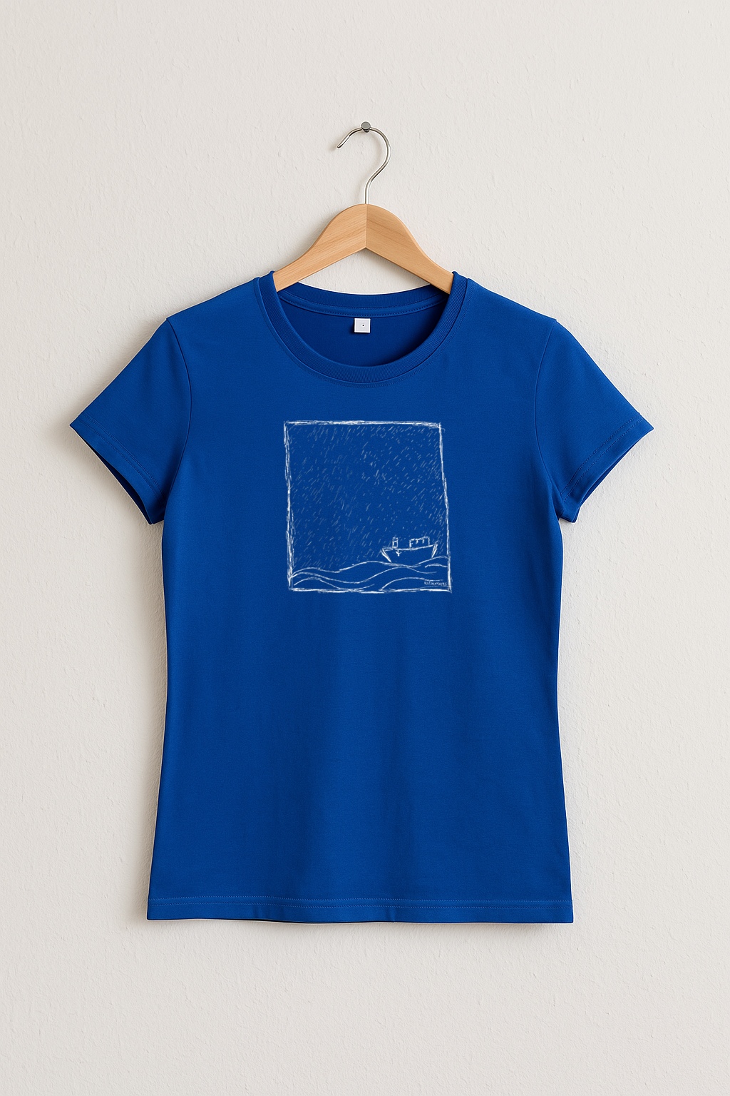 Inspiriert vom rauen Charme der Nordsee: Dieses royalblaue Damen T-Shirt zeigt ein starkes Motiv – ein Fischkutter inmitten von Regen und Wellen. Für alle, die das Meer lieben und Wert auf nachhaltige Mode legen.