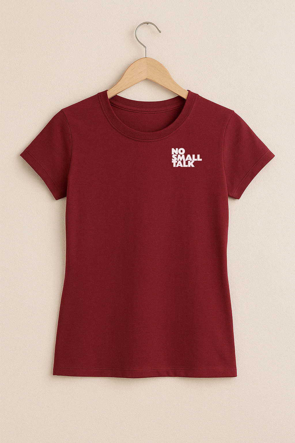 ✅ Farbe: Bordeauxrot mit weißem Brustdruck „no small talk“