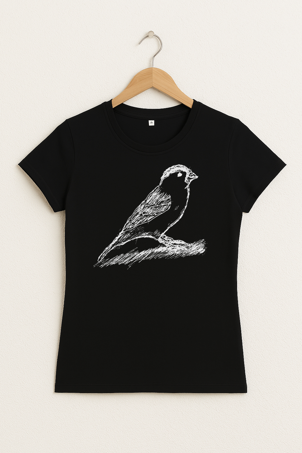 Schlicht, stark und voller Ausdruck: Dieses schwarze Damen T-Shirt zeigt einen großflächigen, fein illustrierten weißen Spatz – handgezeichnet und detailverliebt. Das kontrastreiche Design steht für Klarheit, Naturverbundenheit und ein bewusstes Modeverständnis.