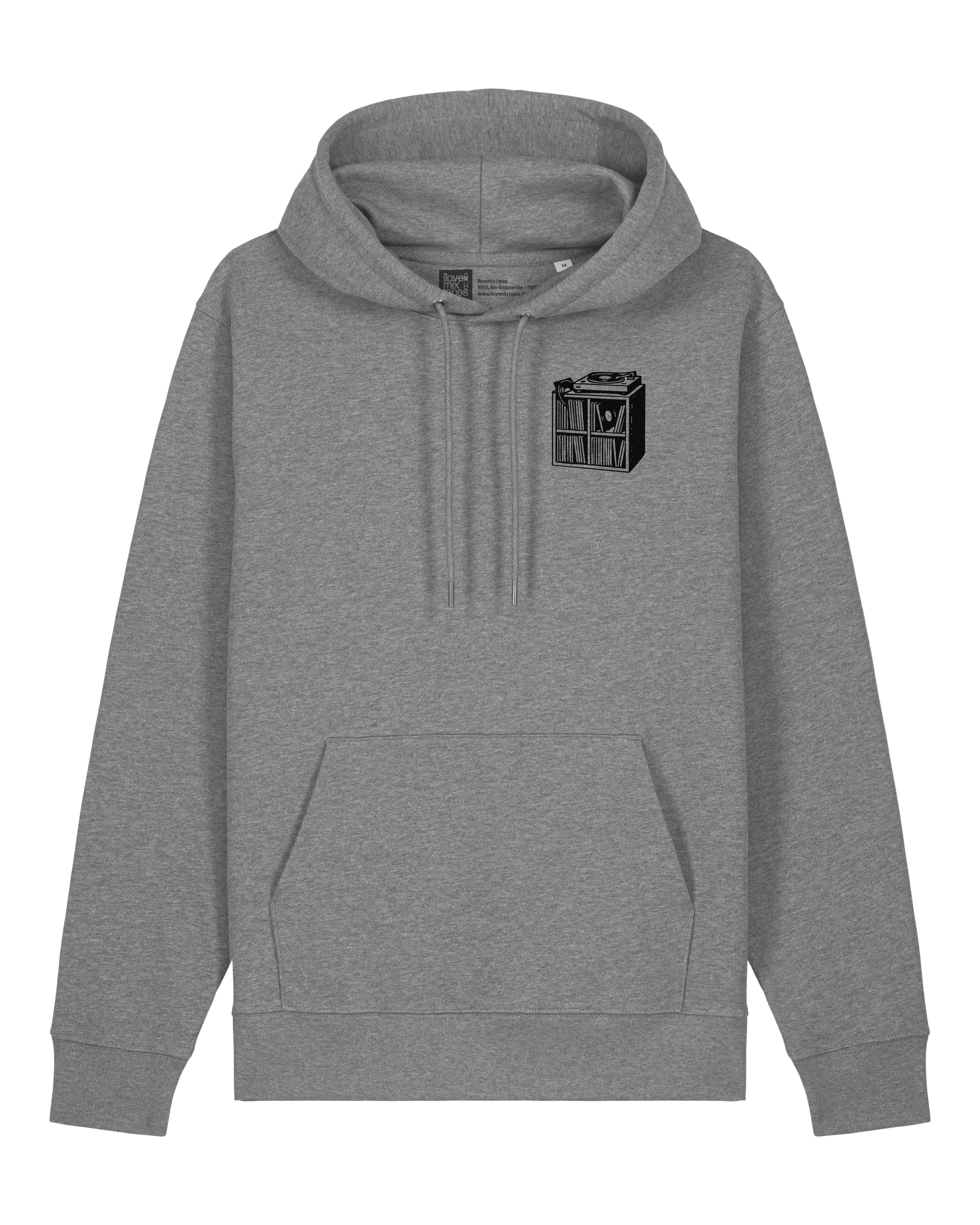 Der Bio Hoodie „Das kleine Schallplattenregal“ ist ein Must-have für Musikliebhaber und Designfans. Das handgezeichnete Motiv zeigt ein kleines Regal voller Vinyl-Schätze – oben drauf ein klassischer Plattenspieler, der nostalgische Wärme und analoge Leidenschaft ausstrahlt.