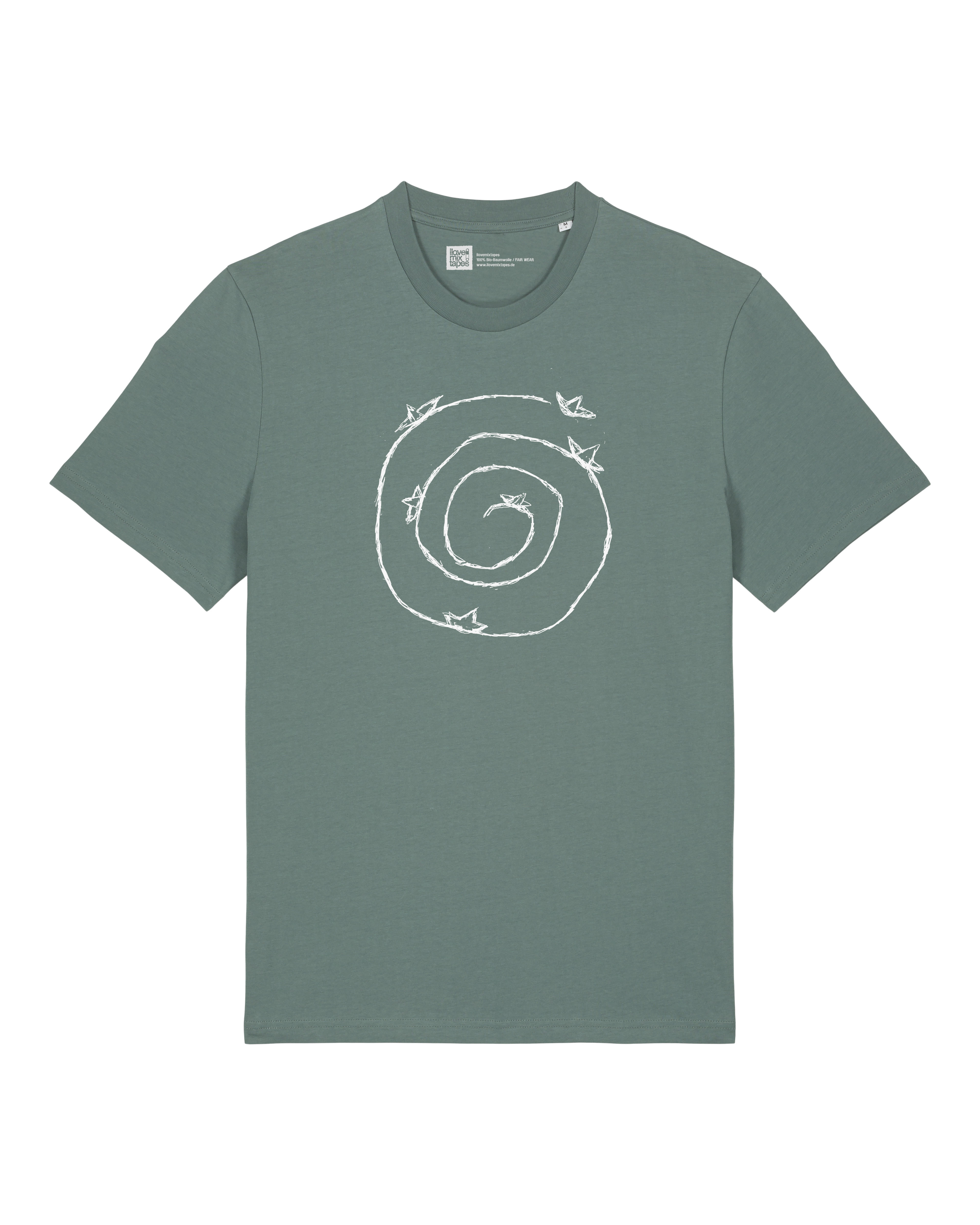 Dieses nachhaltige Unisex Bio T-Shirt in der Farbe Green Bay kombiniert minimalistisches Design mit höchstem Tragekomfort. Das Motiv zeigt eine handgezeichnete weiße Spirale, umgeben von kleinen Papierbooten, umgesetzt im handgemachten Siebdruck-Transfer.
