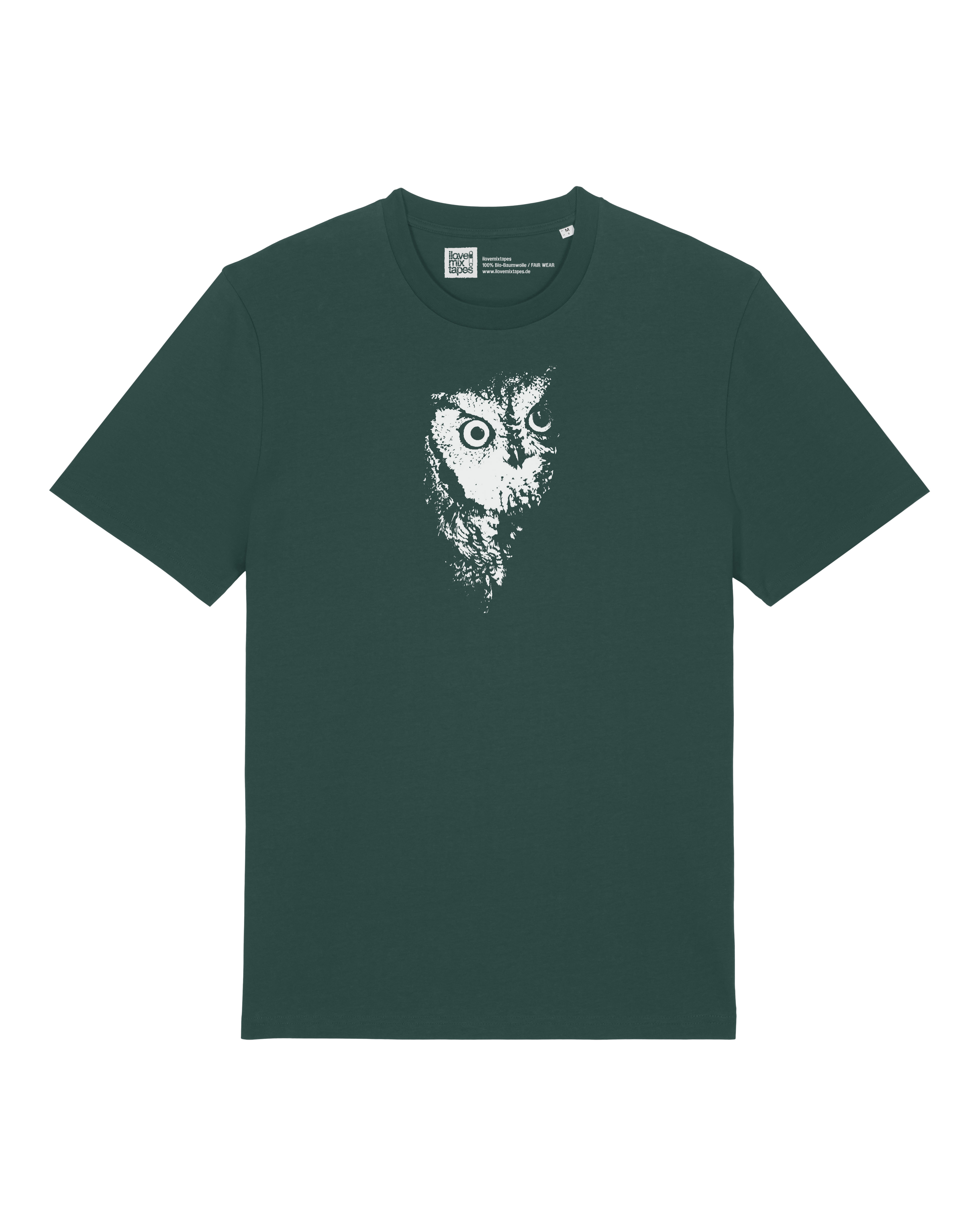 Unisex T-Shirt aus 100 % Bio-Baumwolle in Dunkelgrün mit weißem Eulenmotiv auf der Brust. Der Druck hat einen roughen, grafischen Stil und wird per Siebdruck-Transfer in meinem Atelier in Frankfurt am Main von Hand aufgebracht – mit wasserbasierter, veganer Farbe.