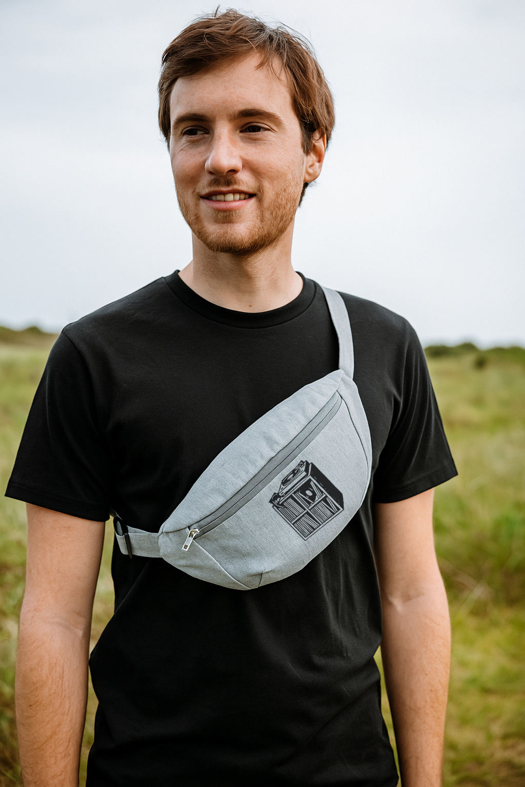 Diese stylische und funktionale Hip Bag aus recyceltem Canvas ist in zwei Farben erhältlich – Grau oder Natur – und mit meinem eigens entworfenen „Das kleine Plattenregal“-Motiv verziert.