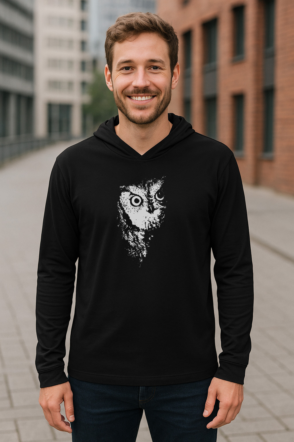 Entdecke den leichten Unisex Jersey Hoodie mit Eulenprint – die perfekte Kombination aus Kapuzenpullover und Longsleeve. Durch seinen lässigen Schnitt sitzt er bequem wie ein Hoodie, bleibt dabei aber leicht und angenehm wie ein Longsleeve.