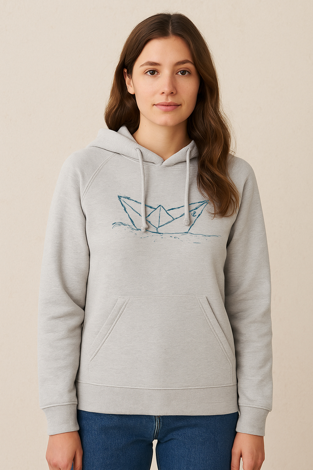 Dieser hochwertig gefertigte Damen-Hoodie in Hellgrau vereint minimalistisches Design mit maritimer Note: Auf der Brust befindet sich ein blaues Paperboat-Motiv, das von Hand im Siebdruck-Transferverfahren aufgebracht wurde – individuell, liebevoll und in kleiner Auflage von mir selbst gedruckt.