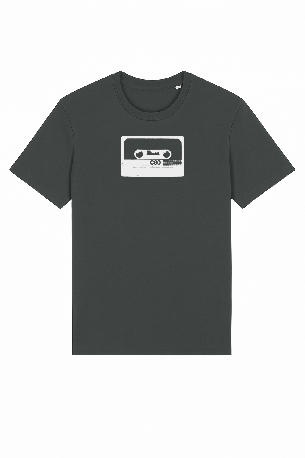 Dieses Unisex-T-Shirt in der zeitlosen Farbe Anthrazit trägt ein stilisiertes C90 Kassetten-Motiv als weißen Siebdruck auf der Brust – perfekt für Musikliebhaber, Retro-Fans und alle, die ein Statement setzen möchten.