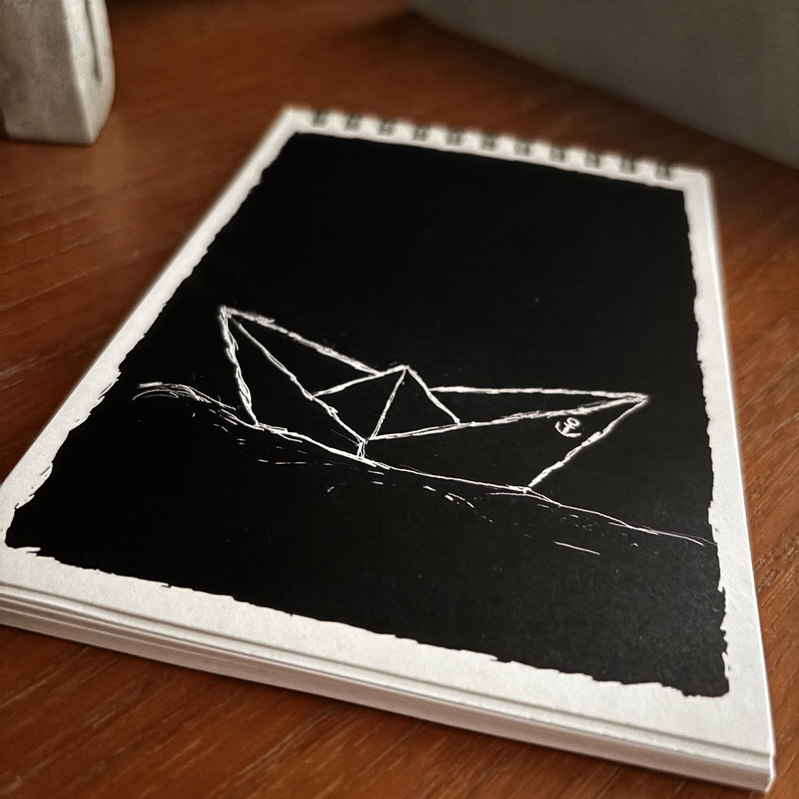 Auf der Vorderseite ziert ein handgezeichnetes Paperboat-Motiv im schwarzen Rahmen den Umschlag – schlicht, maritim und stilvoll.