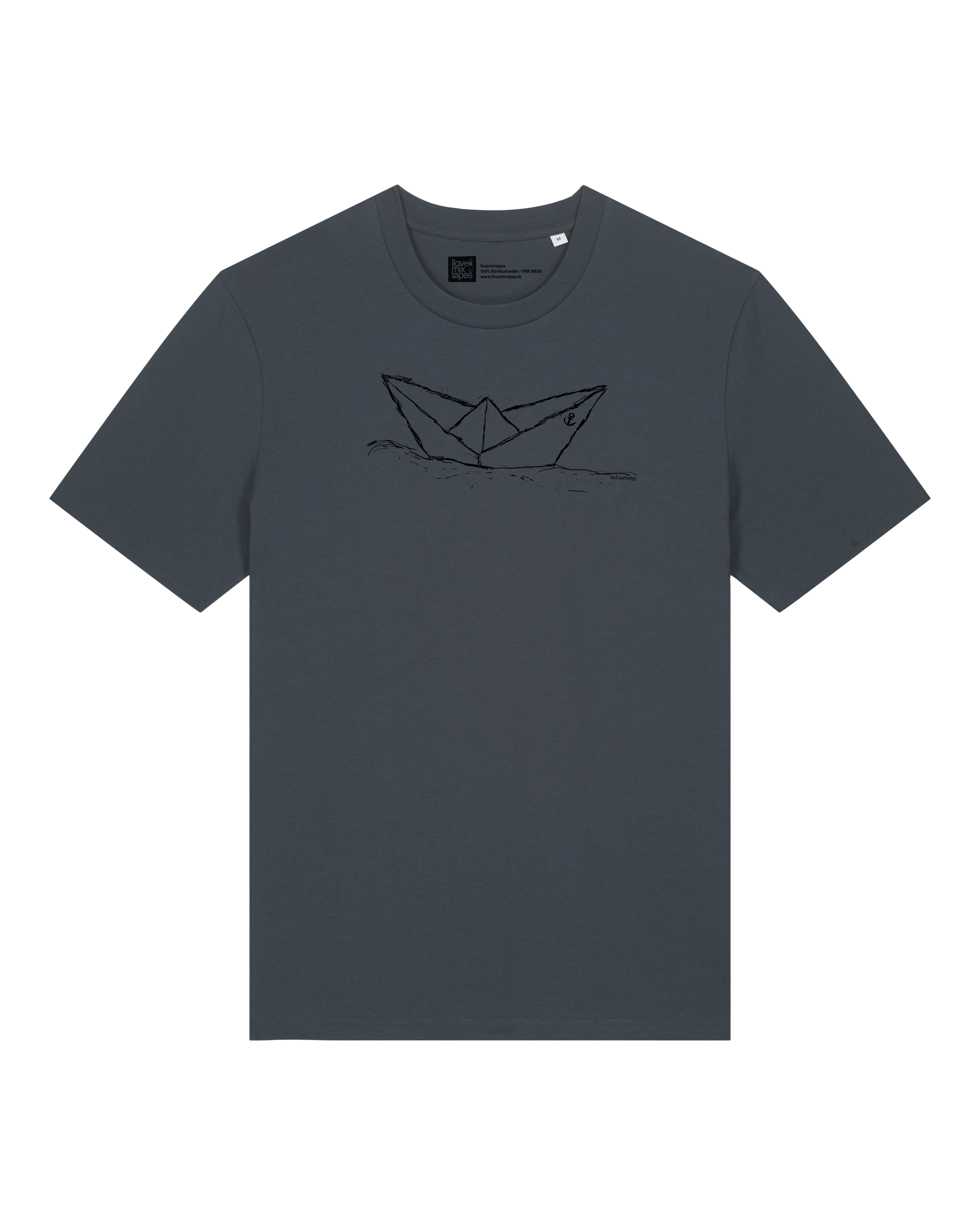 Schlicht und stark im Design: Dieses T-Shirt zeigt ein schwarzes Paperboat – per Hand im Atelier in Frankfurt am Main gedruckt. Das Motiv wird im Siebdruck-Transferverfahren mit veganer, langlebiger Farbe aufgebracht.