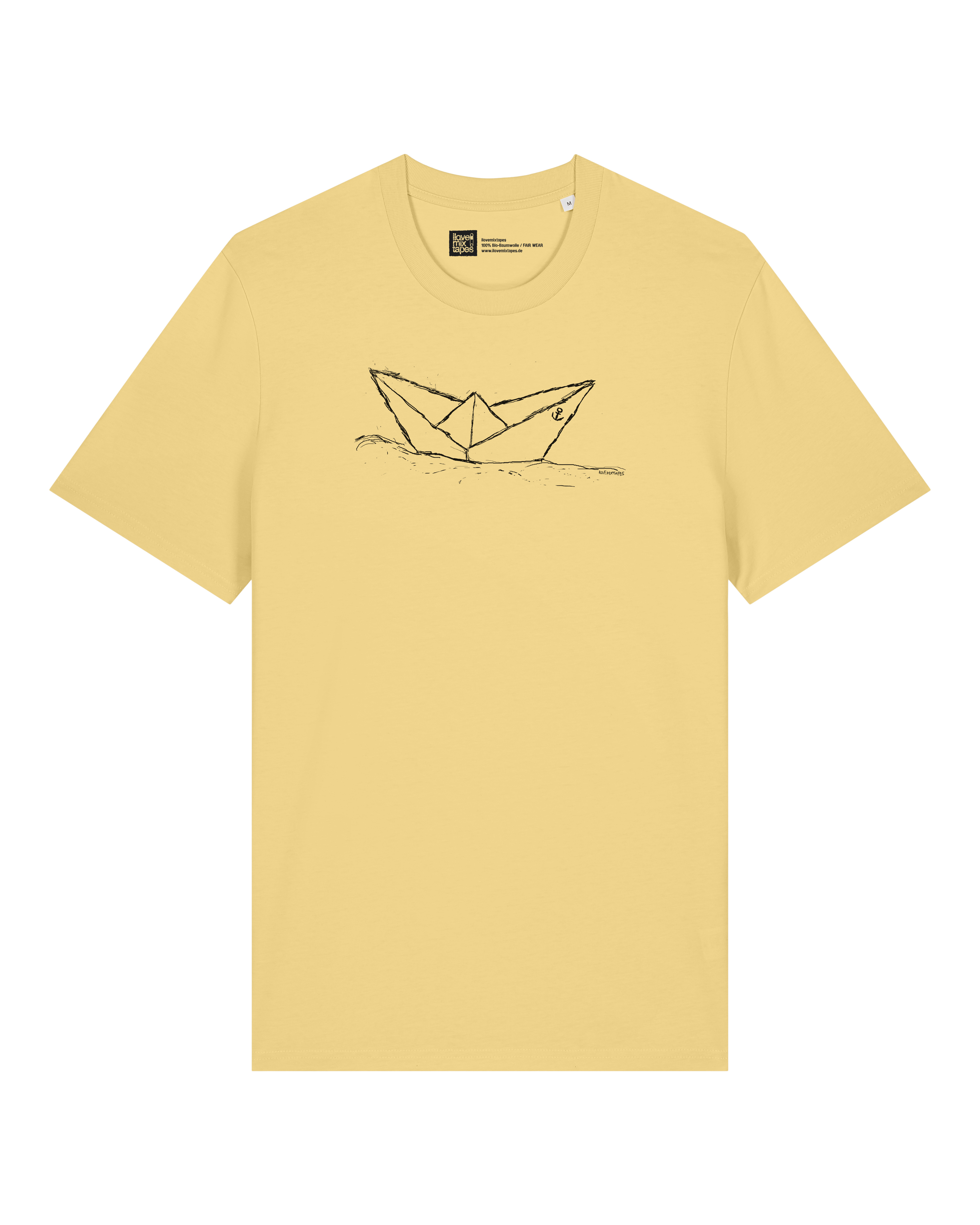 Dieses Unisex T-Shirt in leuchtendem Viva Yellow zeigt das klassische Paperboat-Motiv als schwarzen Siebdruck. Das Motiv wird in meinem Atelier per Siebdruck-Transferverfahren von Hand aufgebracht – mit veganer, langlebiger Farbe.